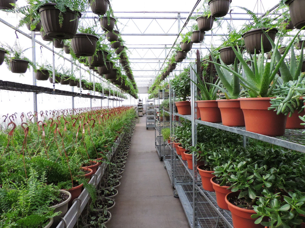 DSCN6623 Published January 29, 2015 at 1000 × 750 Fern baskets waiting to be hung up; carts of stock succulents (closest: my aloe)